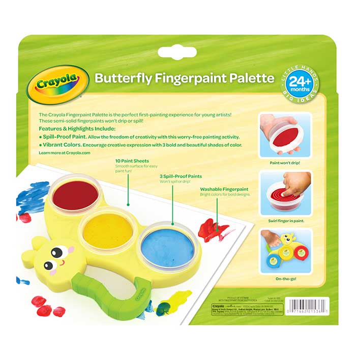 • The Crayola Butterfly Fingerpaint Palette is a colorful way to introduce toddlers to the joy of painting. With three vibrant, spill-proof paint pots and ten large fingerpaint sheets, this set is designed for little hands and big imaginations. The butterfly-shaped tray adds a playful twist, while the quick-dry, washable paints make cleanup easy. Perfect for kids 24 months and up, this kit supports sensory exploration and creative development through hands-on fun. Whether it’s their first art set or a new favorite, this palette makes a delightful gift that inspires confidence and creativity.