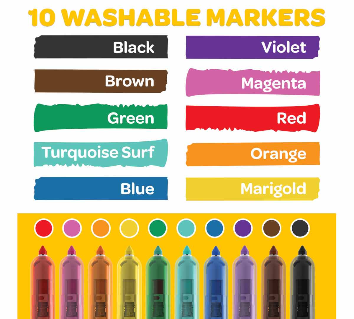 WASHABLE MARKERS: Color comfortably knowing these colors wash from most washable clothing and skin!
