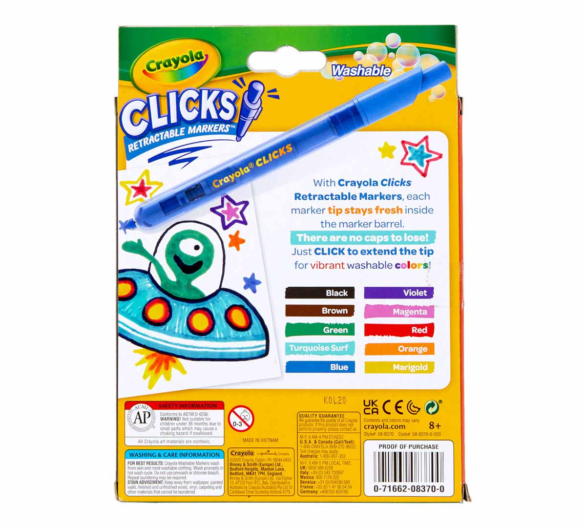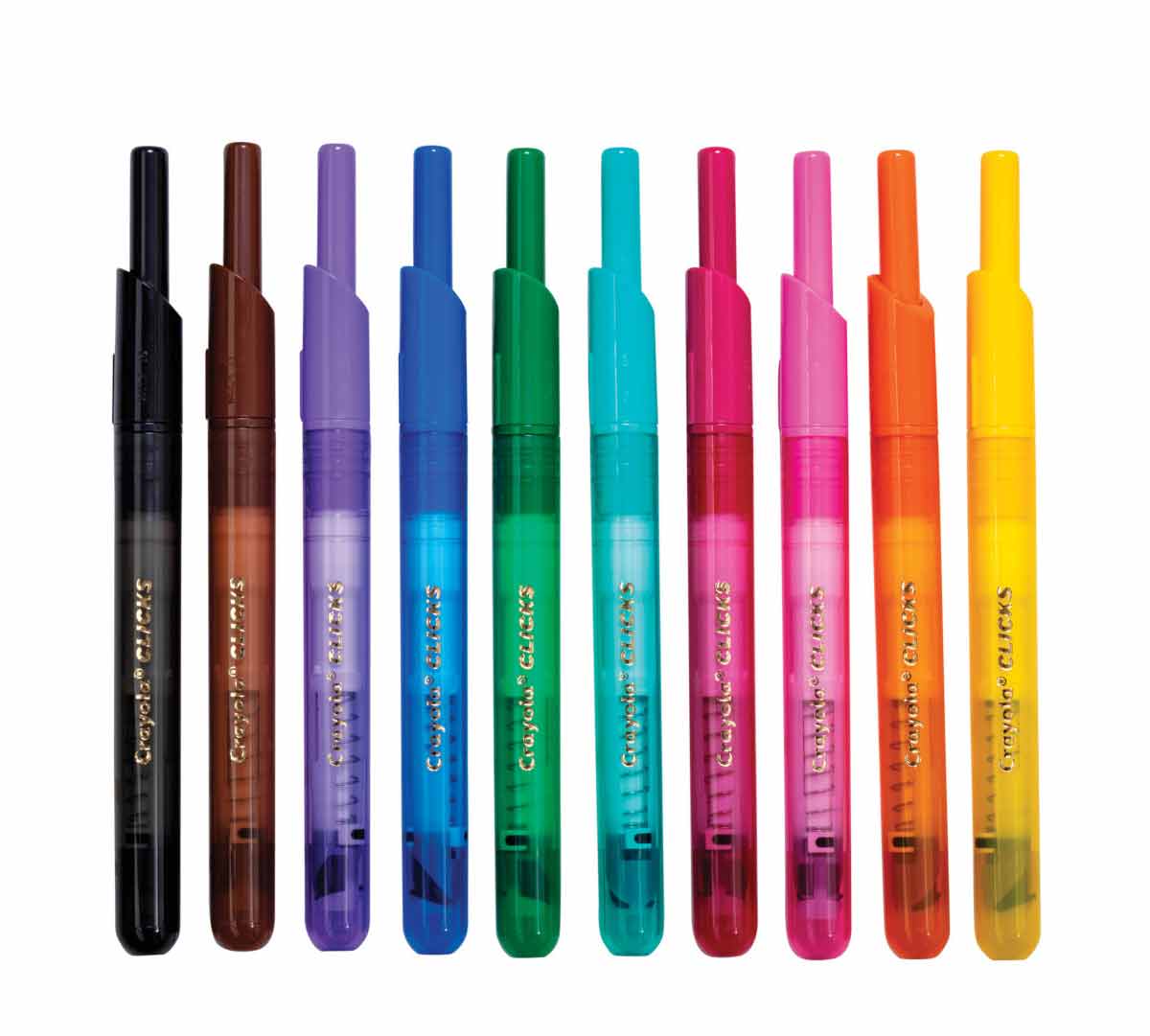 • No more lost caps or dried-out markers! Crayola Clicks Washable Markers are retractable with special ink that is designed to resist drying out. Their conical tips make it possible to create thick and thin lines, while the easy-click design makes them ideal for coloring on the go! Prepare for school projects, crafts, and homework assignments with vibrant colors that wash from skin as well as most washable clothing. Pair this marker set with giant coloring pages or activity books (sold separately) for hours of colorful, creative fun! This set comes with 10 classic colors, ideal for a variety of creative projects.