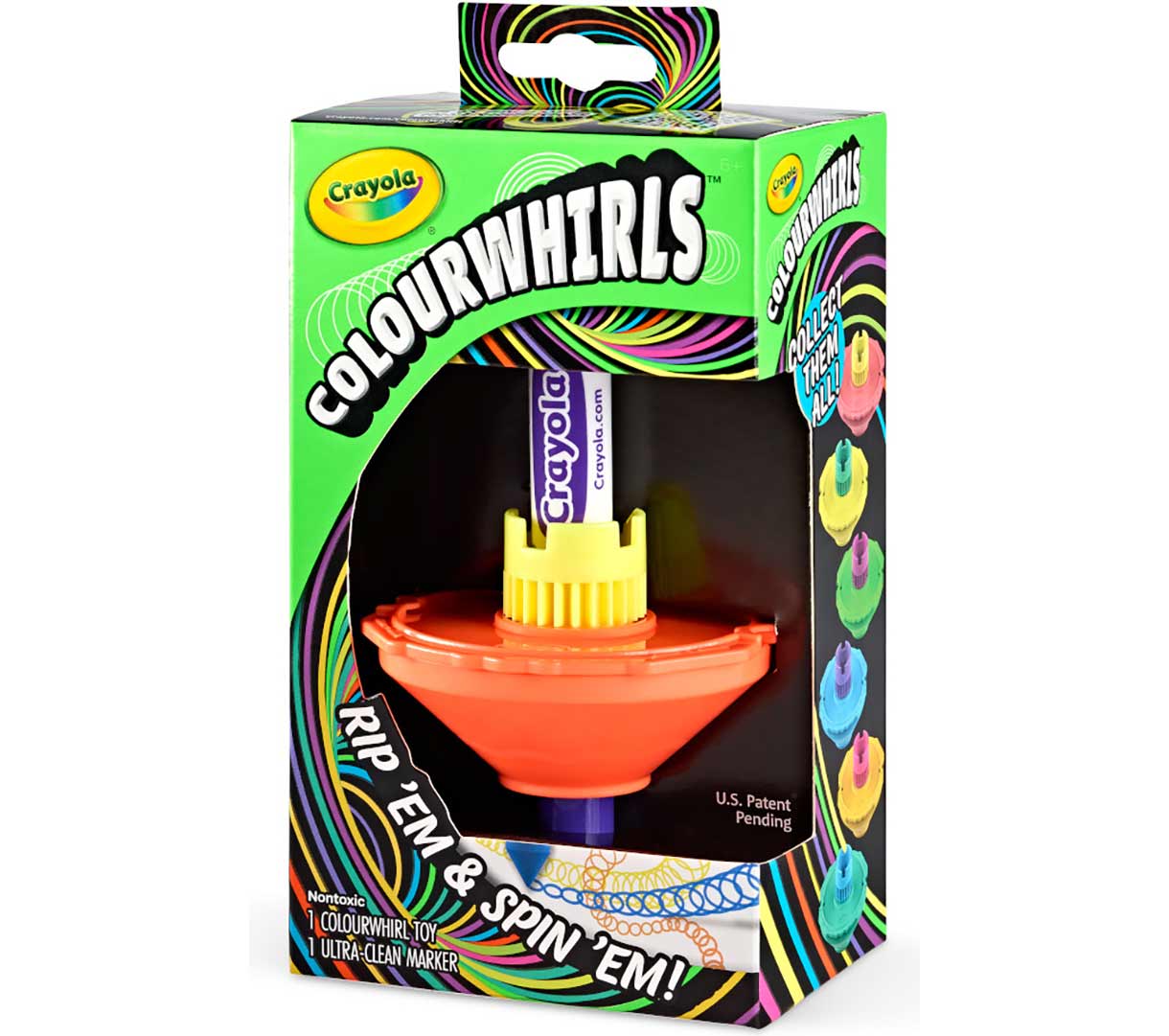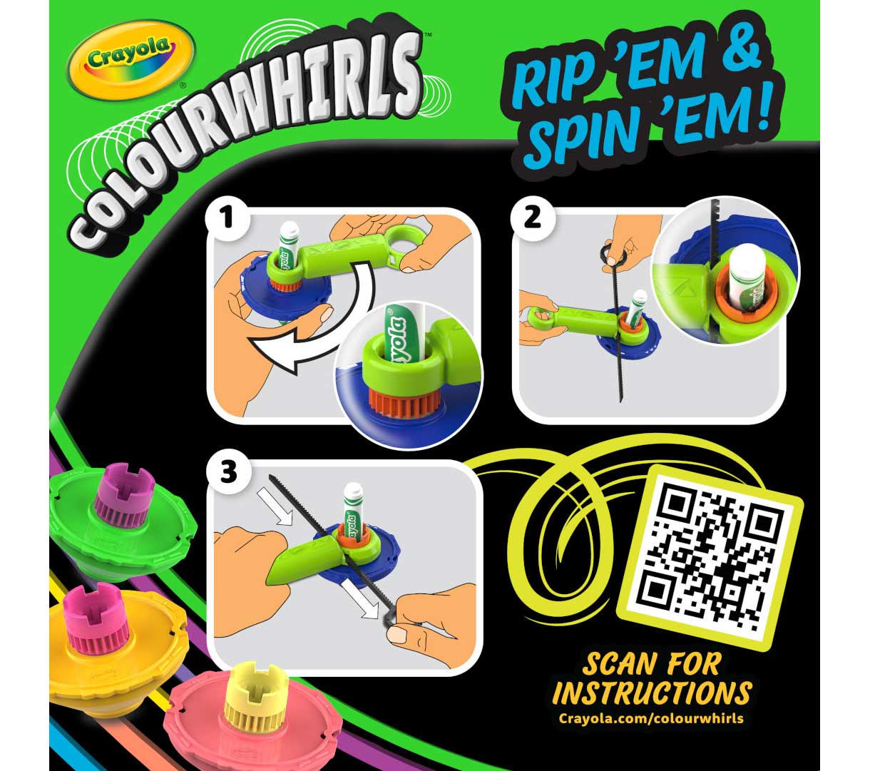 Rip ‘Em, Spin ‘Em, & create unique, spiraling art with Crayola Colourwhirls. This innovative toy offers a fun new way to use Crayola markers, resulting in cool outcomes that will captivate children and adults alike. Compatible with Crayola broadline & fine line markers, Super Tips, and Pip Squeaks, Colourwhirls provide endless possibilities for artistic expression. The recolorable spinner top disc can be customized for added fun and personalization. Simply add your Crayola Markers to the Colourwhirls Spinner and pull the rip cord to create unique and different art every time. Perfect for playing with and competing against friends. An excellent gift choice for children aged 6 and above.