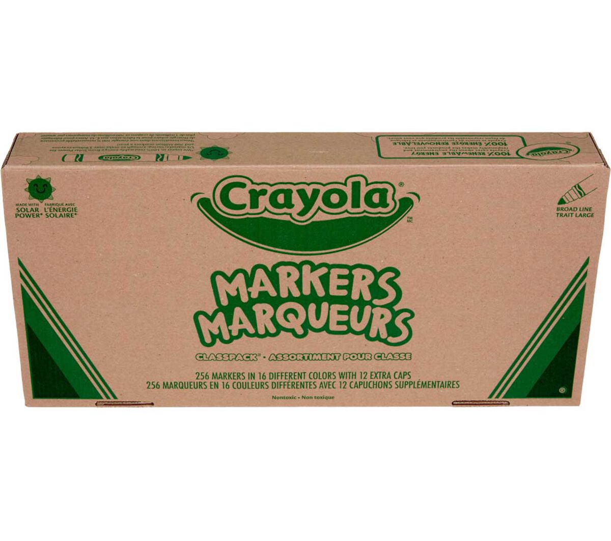 • Crayola Classic Broad Line Markers are the classic, long-lasting, durable markers you know from your childhood. They lay down lots of brilliant color, yet don't bleed through most paper. Put students' imaginations to work with these classic, long-lasting, durable markers which lay down lots of brilliant color, this bulk Broad Line Marker Classpack includes enough supplies for the entire class! A total of 256 markers are included. There are 16 markers in each of the following 16 colors: Yellow, Brown, Orange, Red, Violet, Blue, Green, Black, Flamingo Pink, Dolphin Gray, Sandy Tan, Tiger Orange, Iguana Green, Turquoise, Royal Purple and Raspberry.