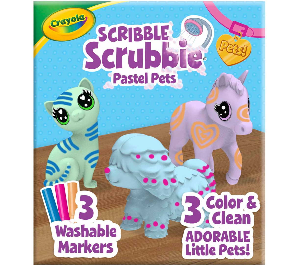• SCRIBBLE SCRUBBIE PASTEL PET SET: This set includes 3 Scribble Scrubbie Pastel Pets, a Scrub Brush, and 3 Washable Markers.