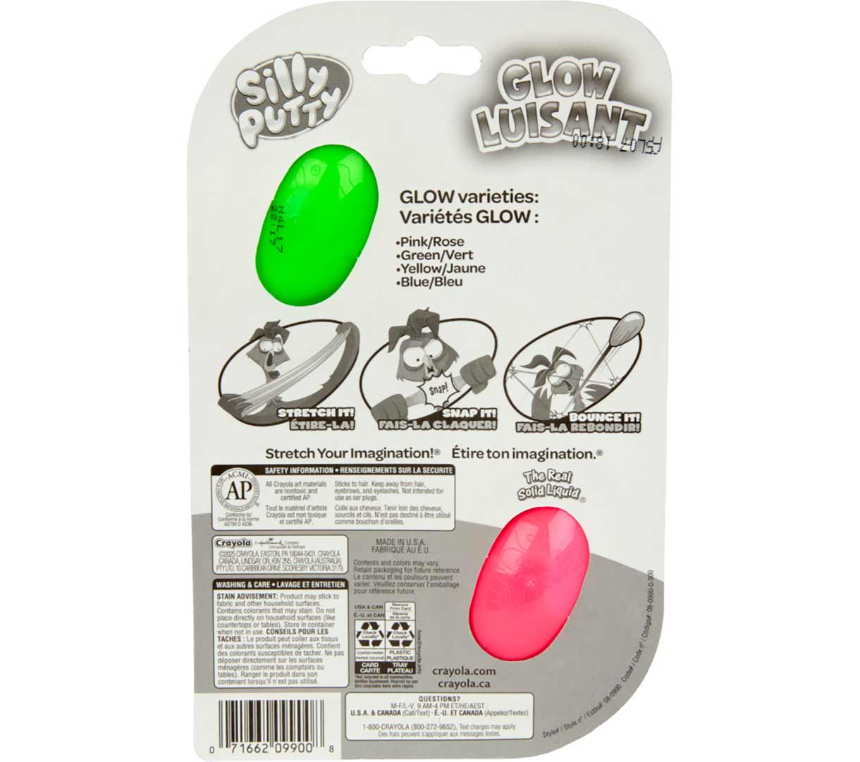 • GLOW-IN-THE-DARK FUN: Includes two glow Silly Putty eggs in bright color combos like pink/green or blue/yellow.