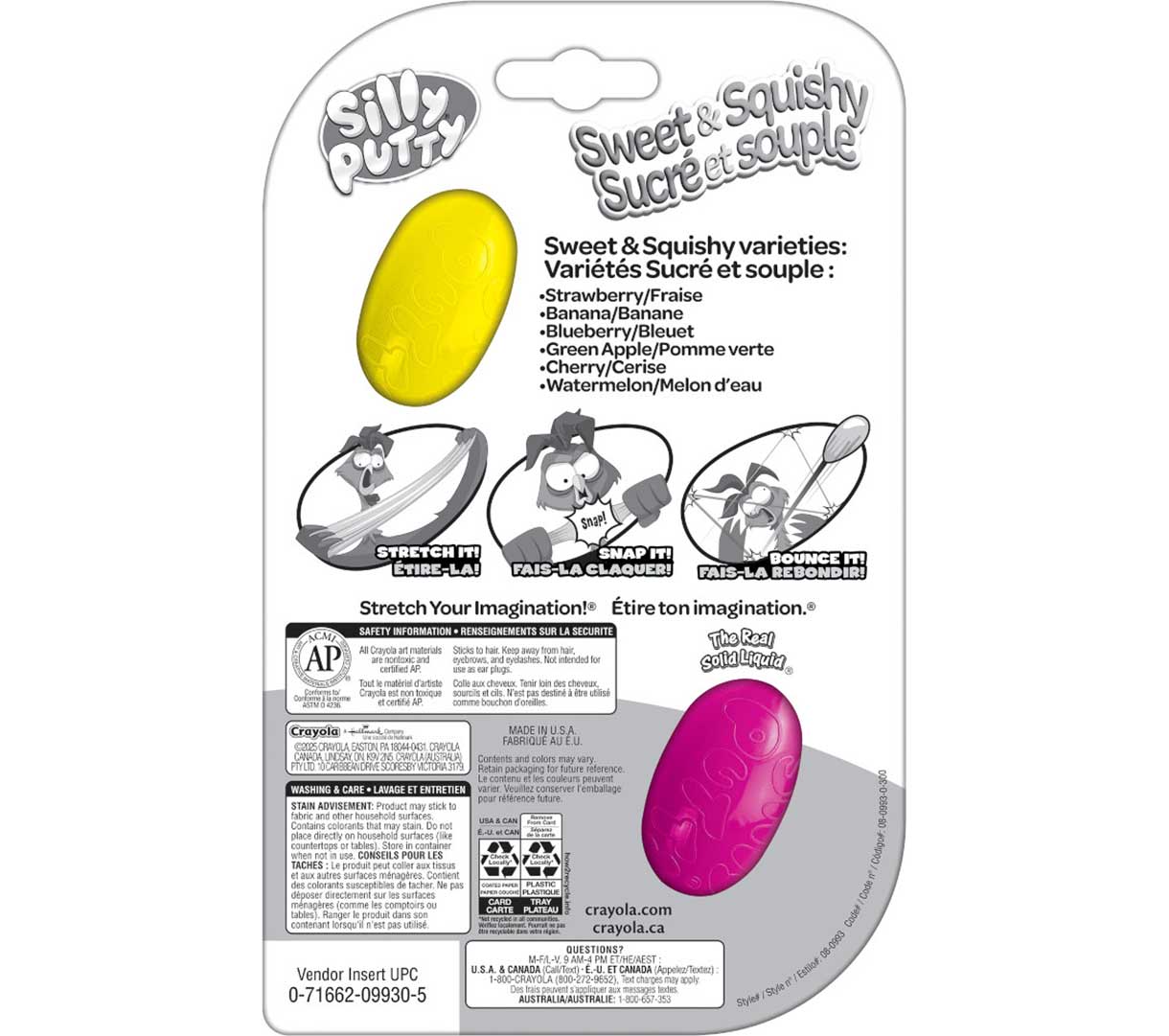 • Experience the joy of play with the Silly Putty 2 Count Scented Eggs. This set includes two scented eggs in pairs like Banana & Strawberry, Watermelon & Cherry, or Blueberry & Green Apple. Each egg offers a vibrant and tactile experience, perfect for sensory play. Silly Putty has been cherished for over 70 years for its ability to bounce, mold, snap, and stretch. It’s an excellent fidget toy, requiring no hand-eye coordination. The Silly Putty 2 Count Scented Eggs is a tool for imagination, creativity, and endless fun. It’s nontoxic and recommended for children aged 4 and up. Enjoy the possibilities with Crayola's Scented Silly Putty!