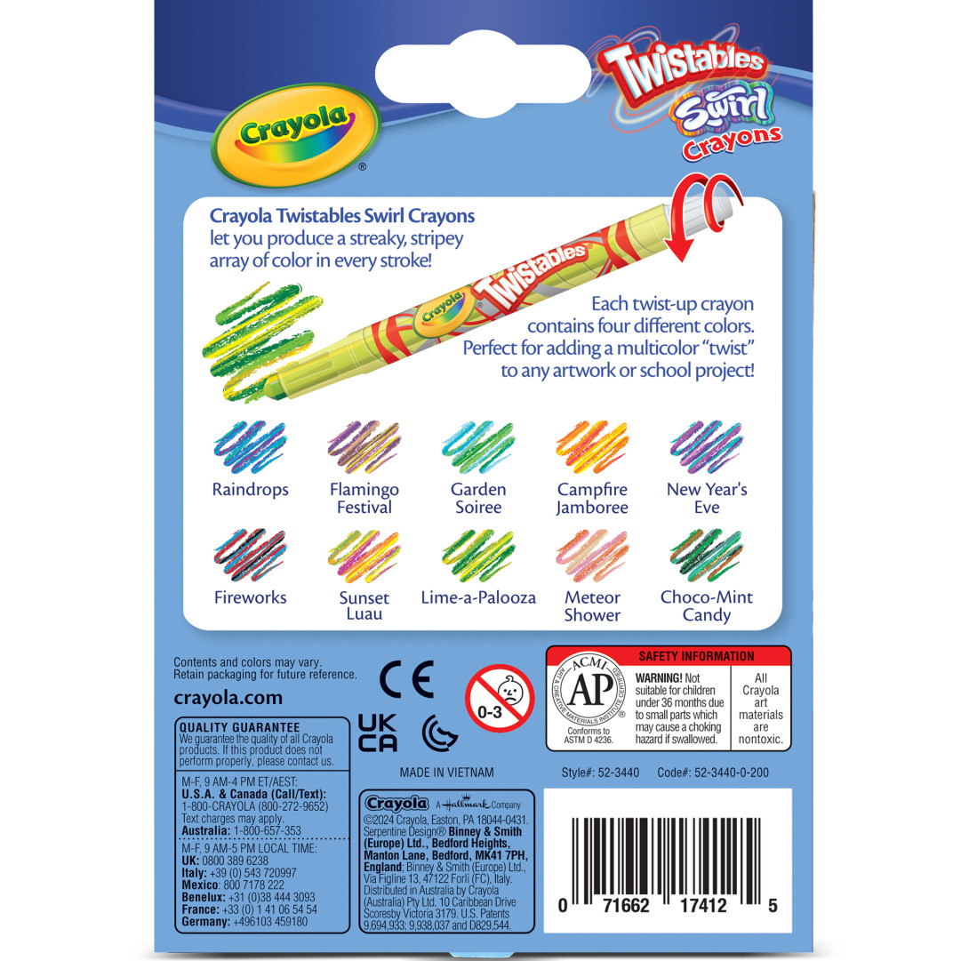 • Experience an explosion of colour and creativity with Crayola Swirl Mini Twistables Crayons! This fun and vibrant pack of 10 uniquely swirled crayons invites every artist, young or old, to bring their colourful imaginations to life. Our Swirl Technology features 3-4 dazzling colours in each stick, offering a streaky, one-of-a-kind colour laydown that creates multi-hued masterpieces effortlessly! These Mini Twistables are incredibly simple to use; there's no need for sharpening. Just give the crayons a twist and carry on colouring! Perfectly suited for many art projects, these multicolour crayons infuse every colouring book, sketch, or doodle with a pop of dazzling colour. Add these unique coloring tools classroom supplies lists, and empower kids to express themselves creatively while developing fine motor skills. In line with the Crayola commitment to safety, these crayons are nontoxic and suitable for children aged 3+. Get ready for hours of safe, creative play with Crayola Swirl Mini Twistables Crayons!