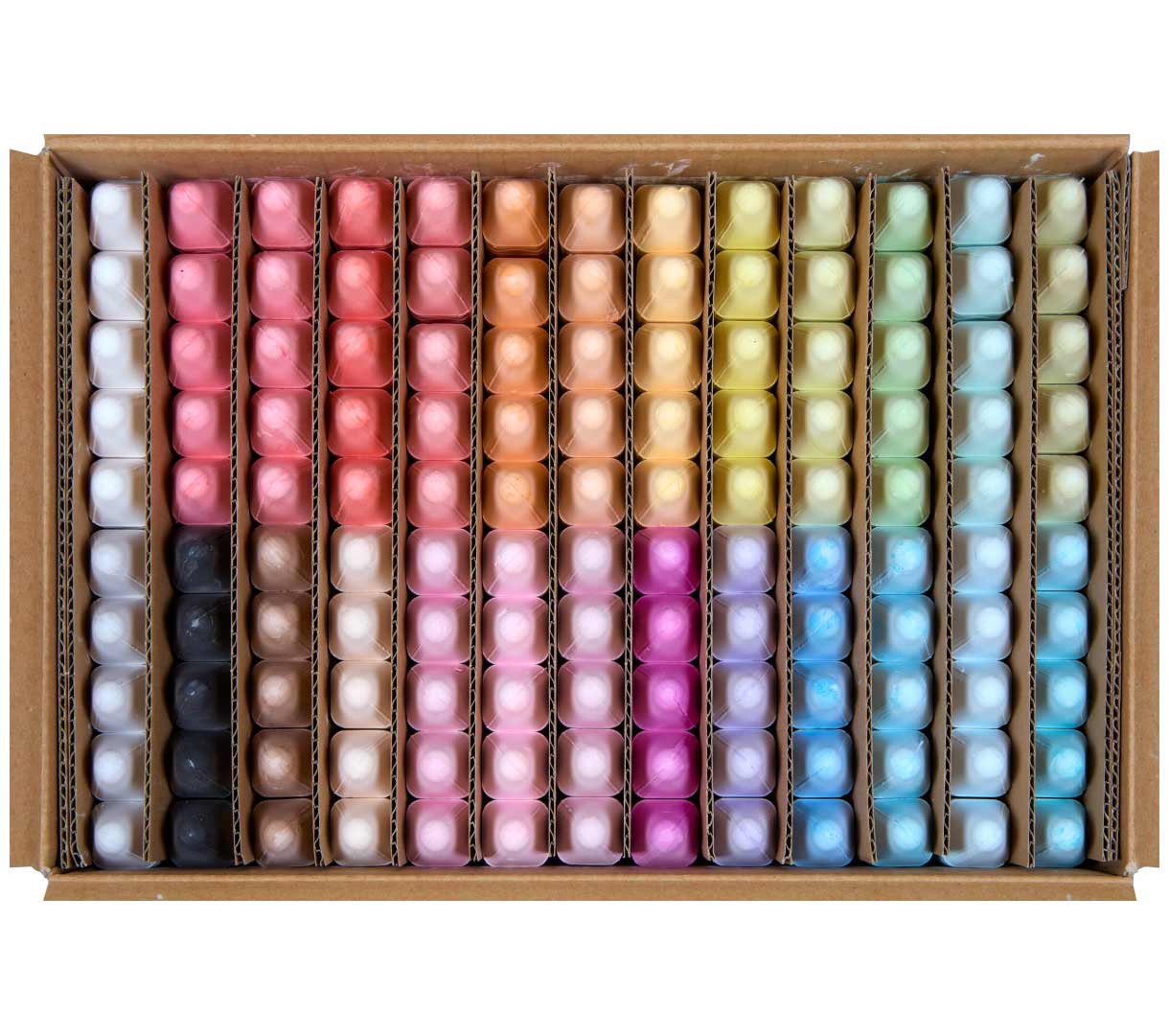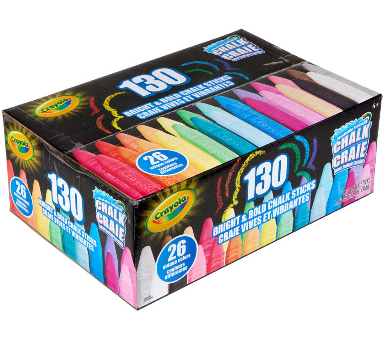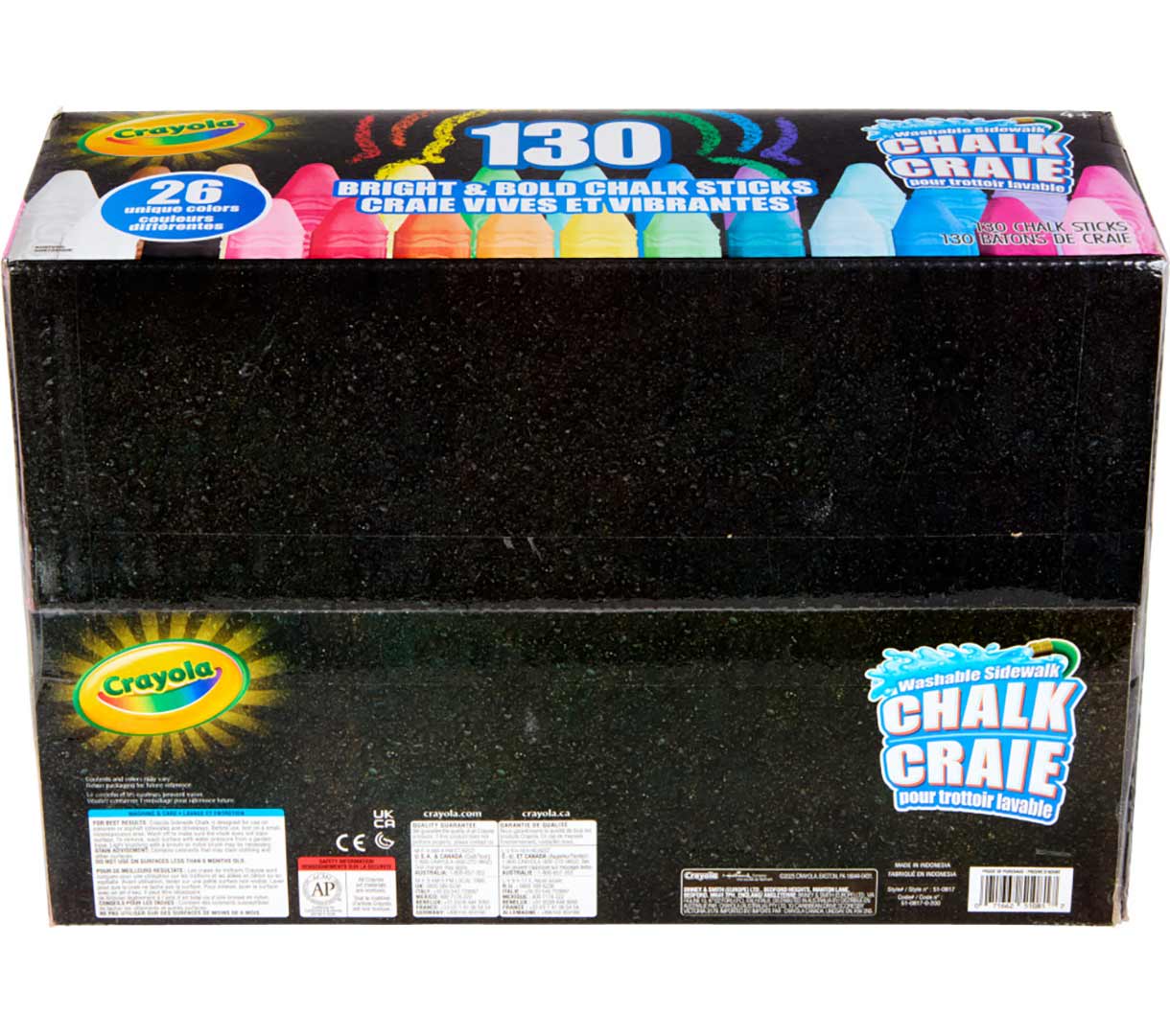• WASHABLE SIDEWALK CHALK: Features 130 vibrant outdoor chalk sticks, featuring 26 unique chalk colors (5 of each color per box).