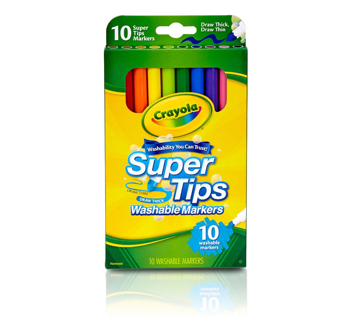 • Crayola Super Tips Markers in the 10ct box are a great complement to kid and adult coloring books. These washable markers offer a variety of vibrant and bold colors that will wash clean from skin and most washable clothing. Super Tips are a unique coloring tool because of their specially designed marker tip, which can be used to create thick and thin lines. This makes them a preferred tool for practicing hand lettering and creating detailed DIY crafts. Pair this set with a Crayola Coloring Book for a great gift idea. It's perfect for birthdays, holidays, and everyday creative play.