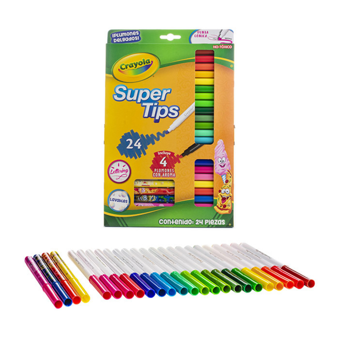 • Nueva y divertida configuración de 24 plumones punta cónica. Ideales para proyectos escolares, con 4 plumones diferenciados con aromas como muffin de moras, pizza, palomita de maíz y algodón de azúcar. Y 20 plumones Super Tips.