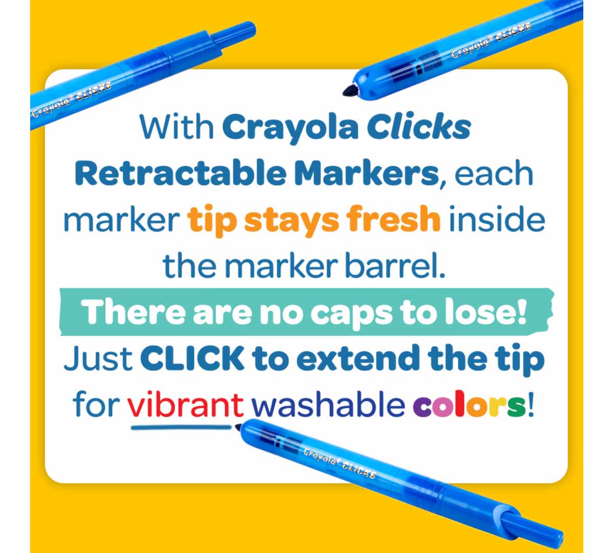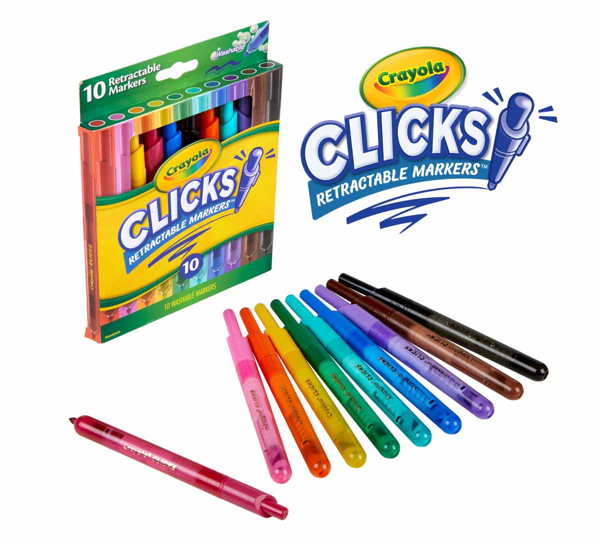 • No more lost caps or dried-out markers! Crayola Clicks Washable Markers are retractable with special ink that is designed to resist drying out. Their conical tips make it possible to create thick and thin lines, while the easy-click design makes them ideal for coloring on the go! Prepare for school projects, crafts, and homework assignments with vibrant colors that wash from skin as well as most washable clothing. Pair this marker set with giant coloring pages or activity books (sold separately) for hours of colorful, creative fun! This set comes with 10 classic colors, ideal for a variety of creative projects.
