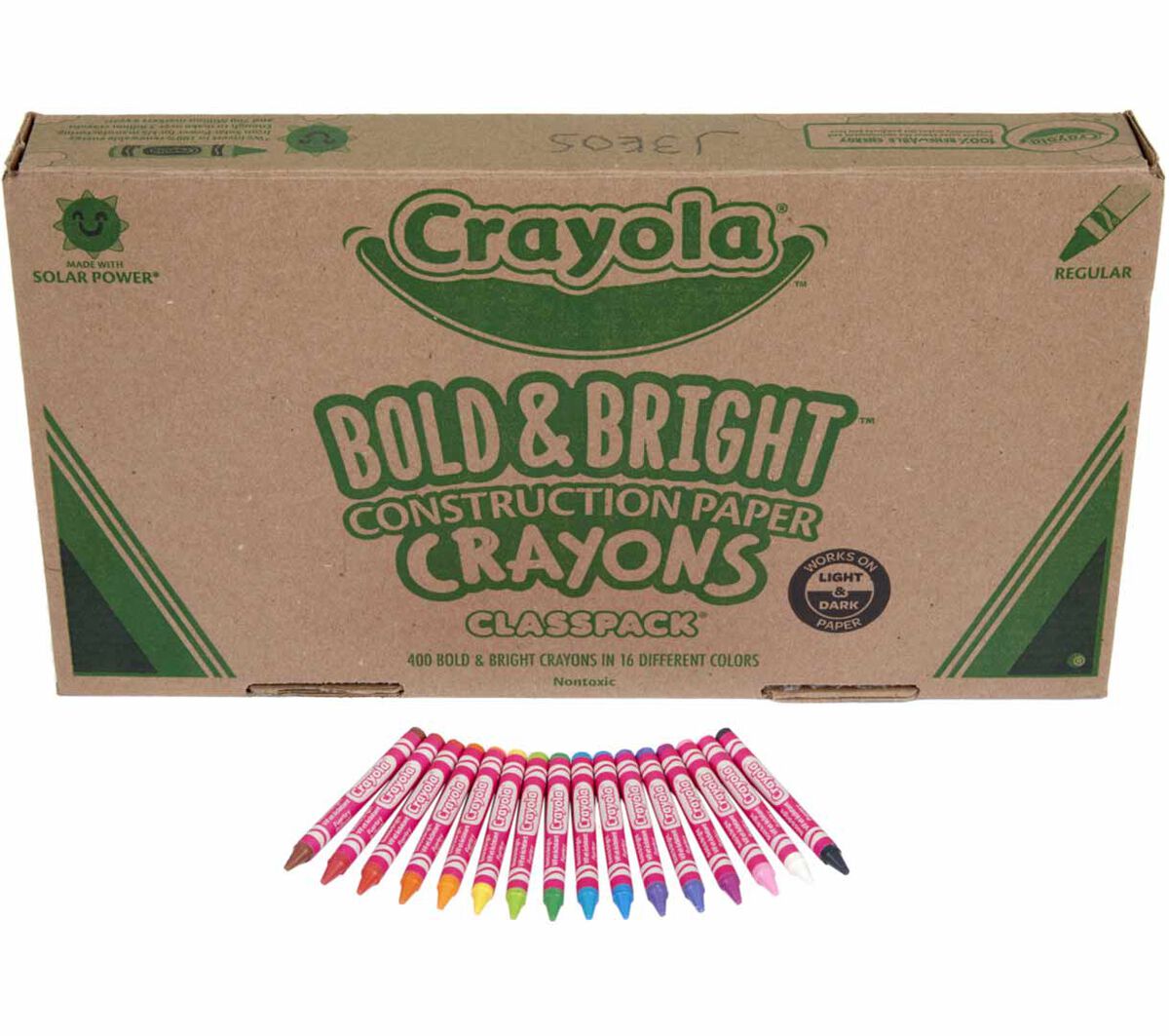 • Stock up on Construction Paper Crayons for the whole classroom to share! This 400ct Bulk Crayons set features 16 assorted Bold and Bright colors including: Pink, Red, Red Orange, Orange, Yellow Orange, Yellow, Yellow Green, Green, Blue Green, Blue, Blue Violet, Violet, Red Violet, Brown, Black and White. With 25 crayons in each color, this box is perfect for DIY crafts, arts and crafts projects, and homework assignments all year long. Double wrapped for long lasting durability, Crayola Class Pack Crayons are sturdy enough to be used by little hands over and over again. Pair with Crayola Construction Paper for the ultimate coloring set! Safe and nontoxic, this bulk crayon set is ideal for children, ages 5 and up.