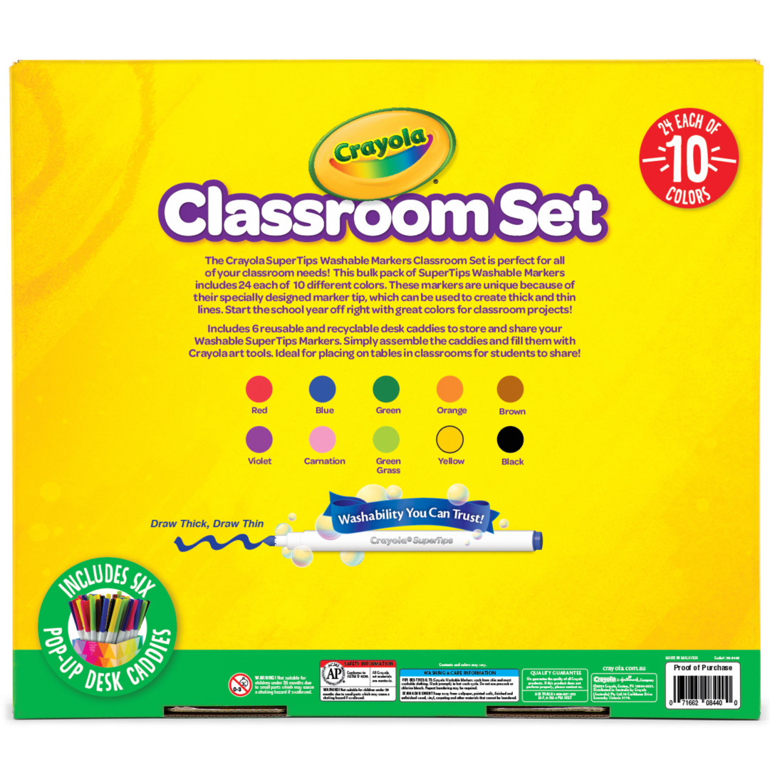 • The Crayola Washable SuperTips Markers Classroom Set is a great way to purchase bold rich, vivid colours in bulk. These markers feature a versatile conical tip for thick or thin lines. They're non-toxic for peace of mind. This Crayola 240 Washable SuperTips Classroom Set includes 24 each of 10 different colours. The set features 6 Pop-Up Desk Caddies designed to store and share art tools on classroom tables.