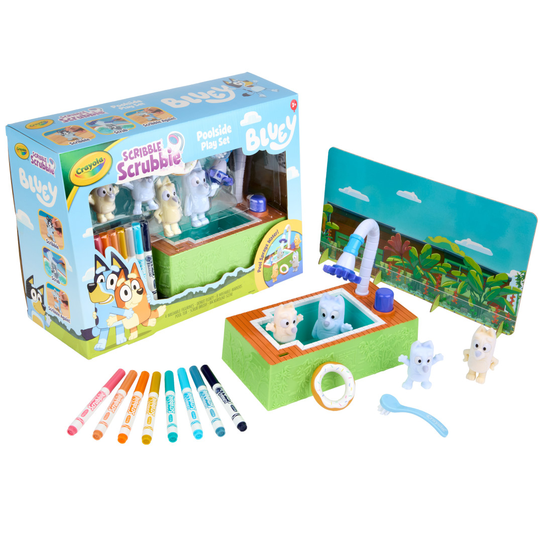 • Bring the imaginative world of Bluey to life with the Crayola Scribble Scrubbies Bluey Playset! This creative kit includes four adorable characters—Bluey, Bingo, Chilli, and Bandit—along with a pump pool, innertube, scenic recolorable backdrop, eight washable markers, and a scrub brush. Kids can color and customize their favorite Heeler family members, then wash them clean and start the fun all over again. With endless possibilities for creativity and storytelling, this set encourages hands-on play and artistic expression. Expand the adventure with additional Scribble Scrubbies sets (sold separately). Safe and non-toxic, it’s the perfect gift for Bluey fans ages 3 and up!