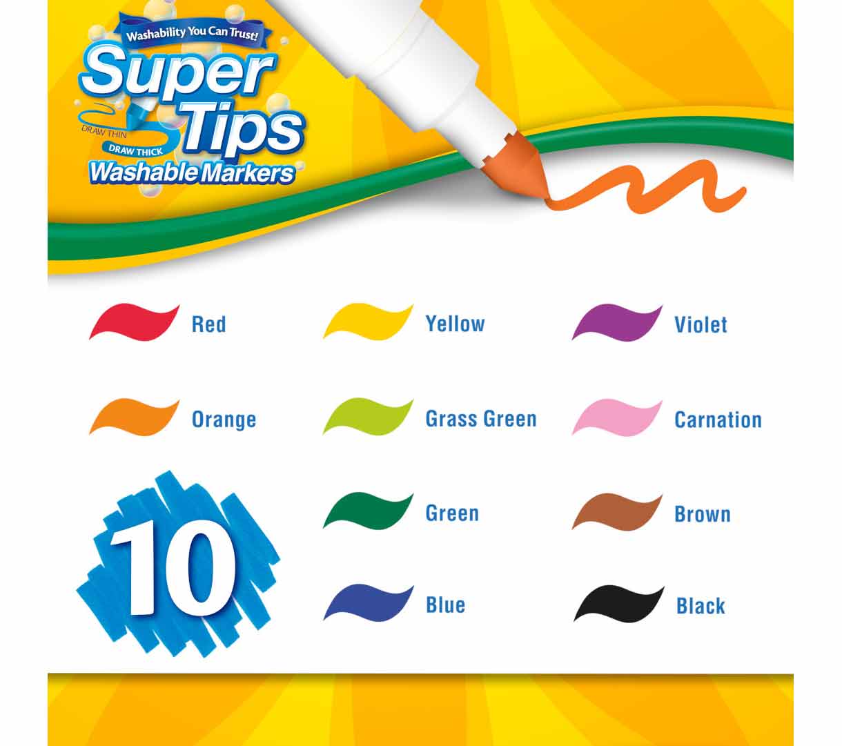 • Crayola Super Tips Markers in the 10ct box are a great complement to kid and adult coloring books. These washable markers offer a variety of vibrant and bold colors that will wash clean from skin and most washable clothing. Super Tips are a unique coloring tool because of their specially designed marker tip, which can be used to create thick and thin lines. This makes them a preferred tool for practicing hand lettering and creating detailed DIY crafts. Pair this set with a Crayola Coloring Book for a great gift idea. It's perfect for birthdays, holidays, and everyday creative play.